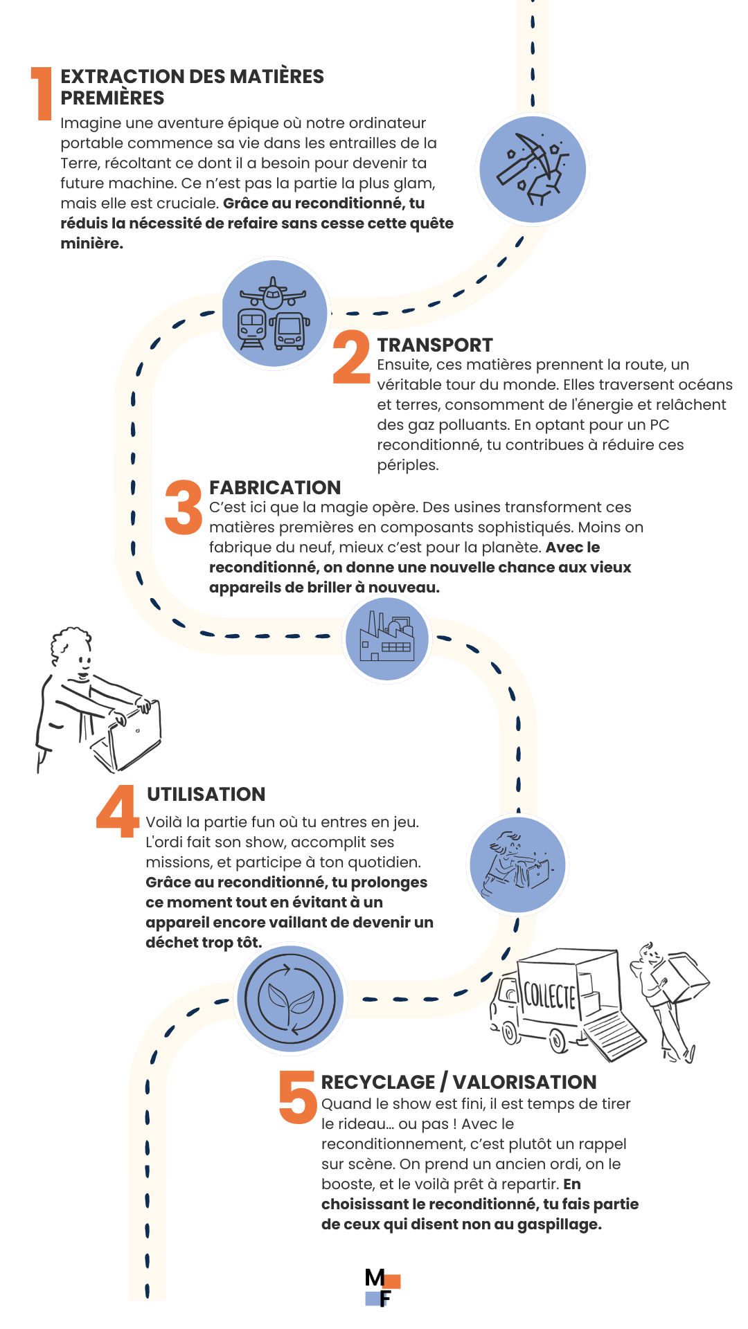 La frise chronologique ci-dessous illustre ces différentes étapes et montre comment le reconditionnement contribue à transformer un modèle linéaire, où tout se termine par un déchet, en un modèle circulaire, où chaque appareil a une chance de briller à nouveau.